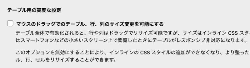 管理画面の設定 > Advanced Editor Toolsメニューへ進み、 「マウスのドラッグでのテーブル、行、列のサイズ変更を可能にする」という項目のチェックを外します。